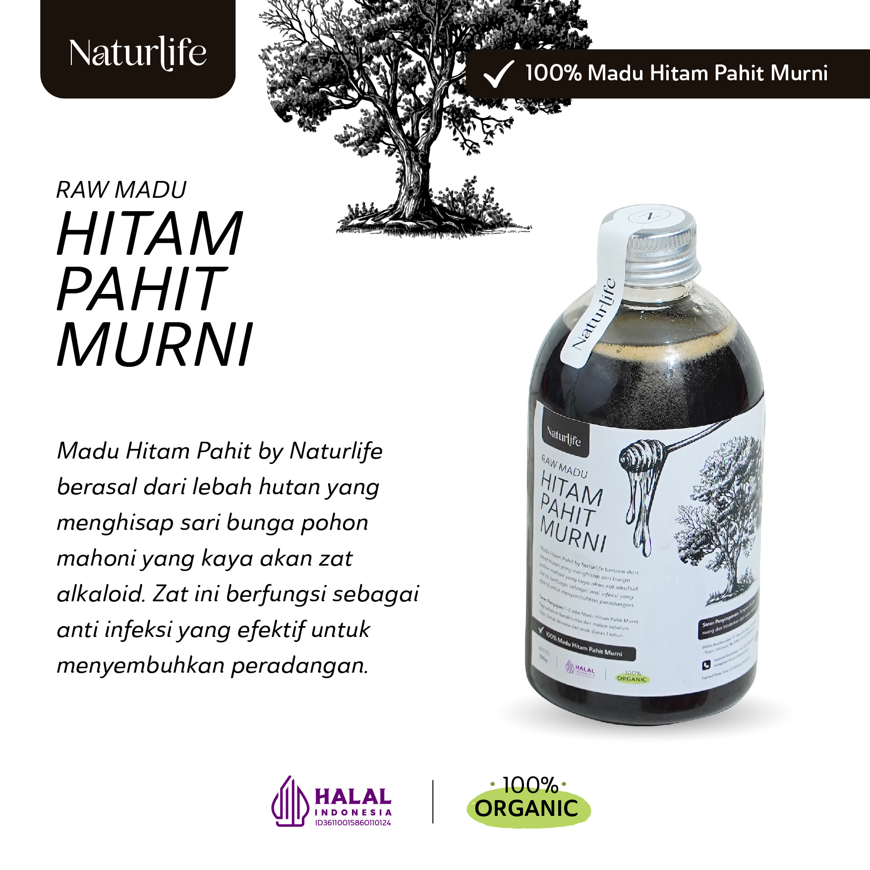 Madu Hitam Pahit Naturlife berasal dari lebah hutan yang menghisap sari bunga pohon mahoni yang kaya akan zat alkaloid. Zat ini berfungsi sebagai anti infeksi yang efektif untuk menyembuhkan peradangan. Manfaat madu hitam lebih baik daripada madu yang berwarna karena mengandung komponen fenol yang lebih tinggi, rasanya pun cenderung lebih pahit dari madu lainnya.