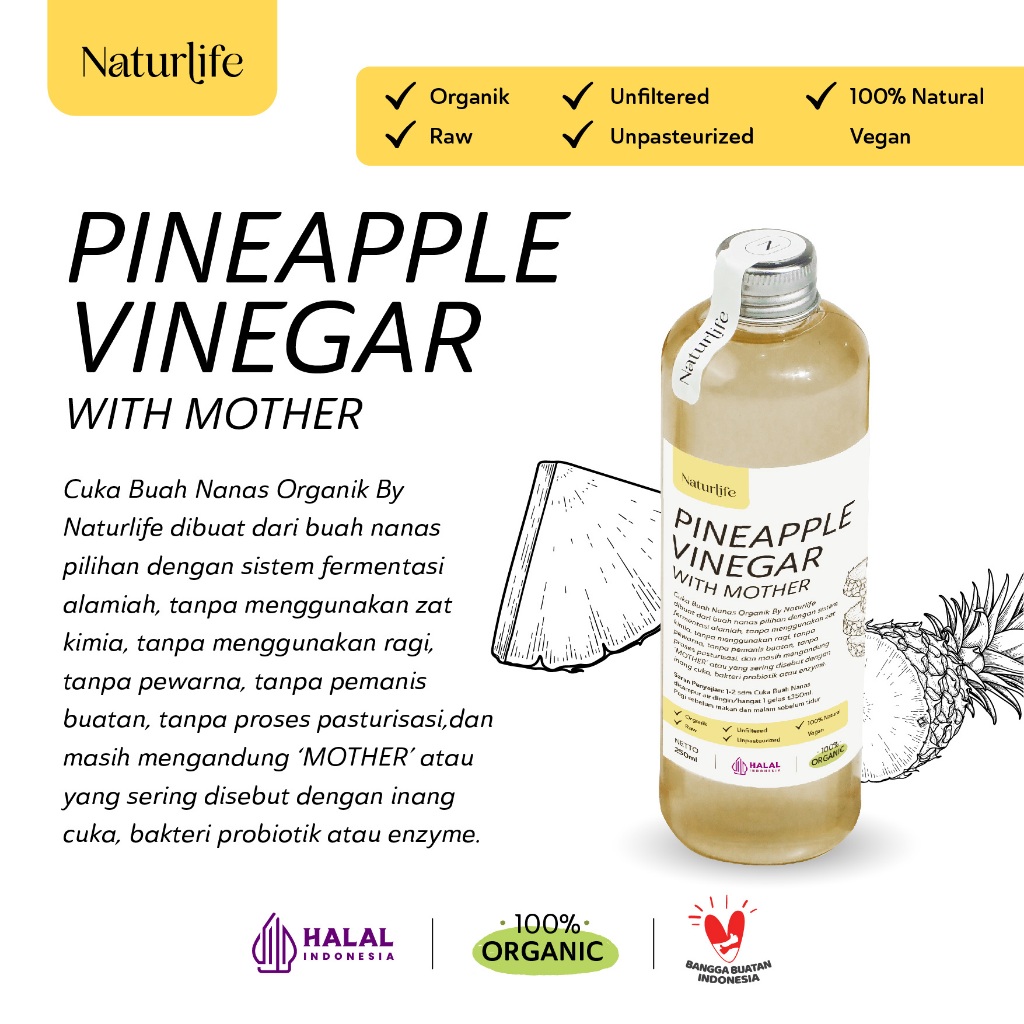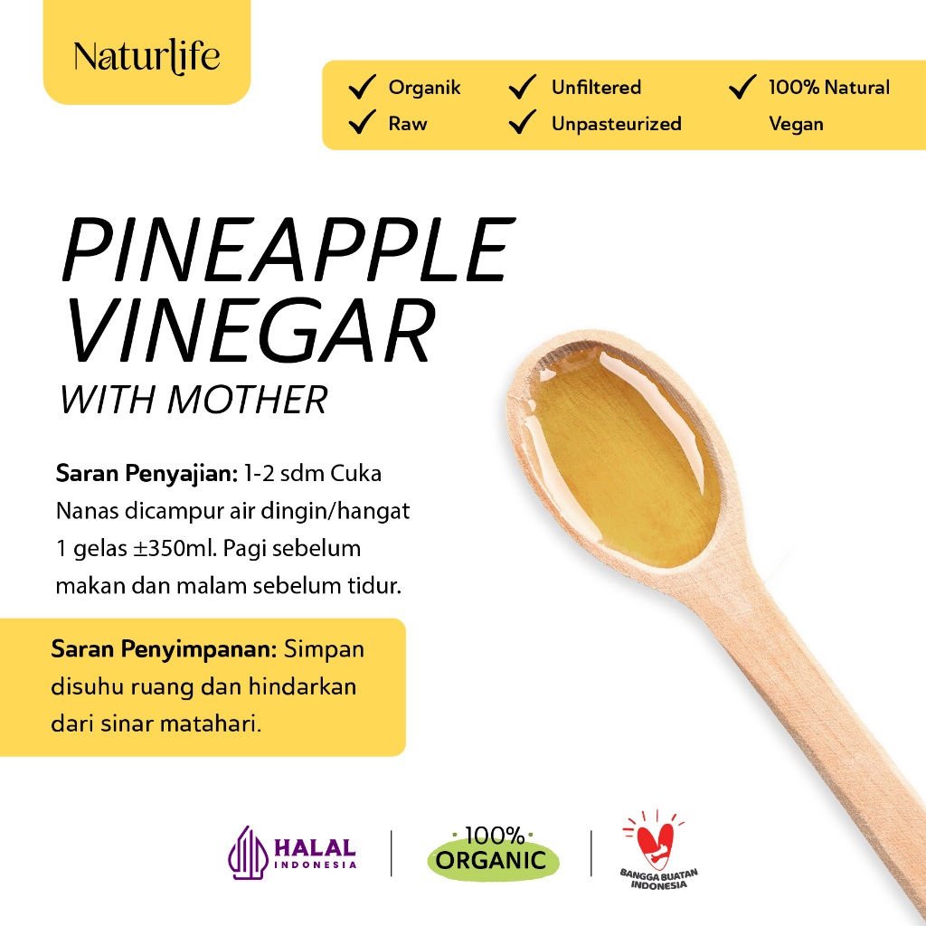 Cuka Buah nanas Organik By Naturlife dibuat dari buah nanas pilihan dengan sistem fermentasi alamiah, tanpa menggunakan zat kimia, tanpa menggunakan ragi, tanpa pewarna, tanpa pemanis buatan, tanpa proses pasturisasi, dan masih mengandung ‘MOTHER’ atau yang sering disebut dengan inang cuka, bakteri probiotik atau enzyme.