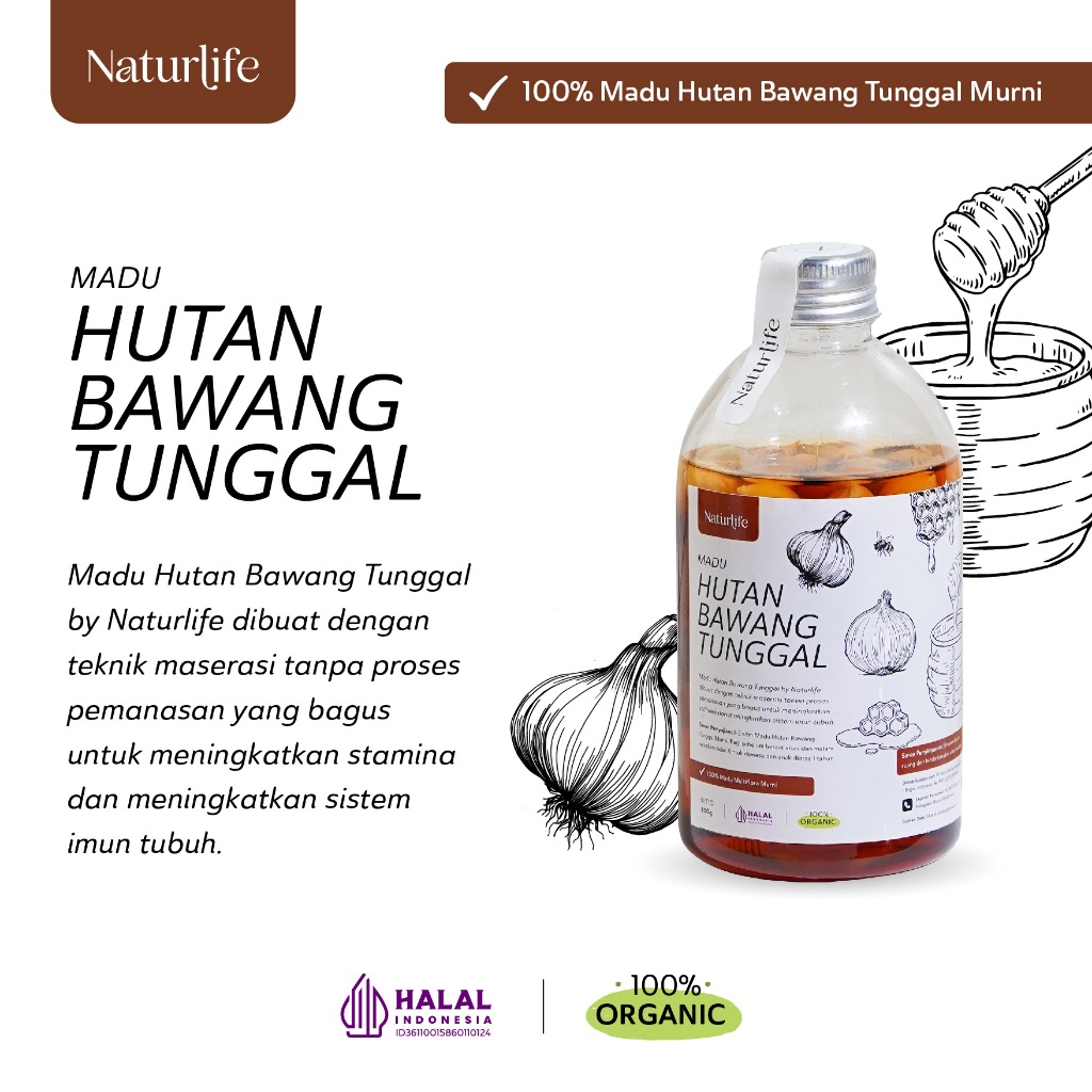 Madu Hutan Bawang Tunggal by Naturlife dibuat dengan teknik maserasi tanpa proses pemanasan yang bagus untuk meningkatkan stamina dan meningkatkan sistem imun tubuh.