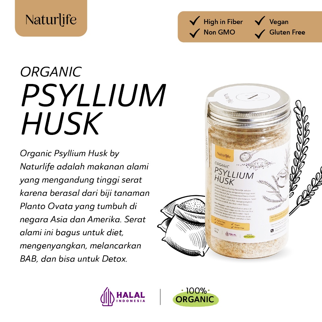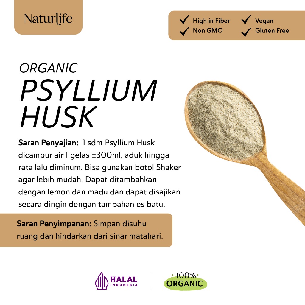 Psyllium husk Naturlife terbuat dari kulit ari tumbuhan plantago ovata ini mengandung 67% serat larut dan 33% serat tidak larut yang bersifat laksatif.