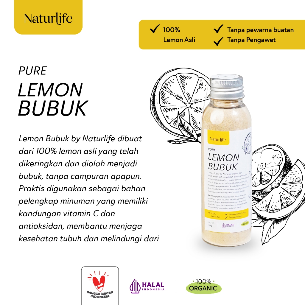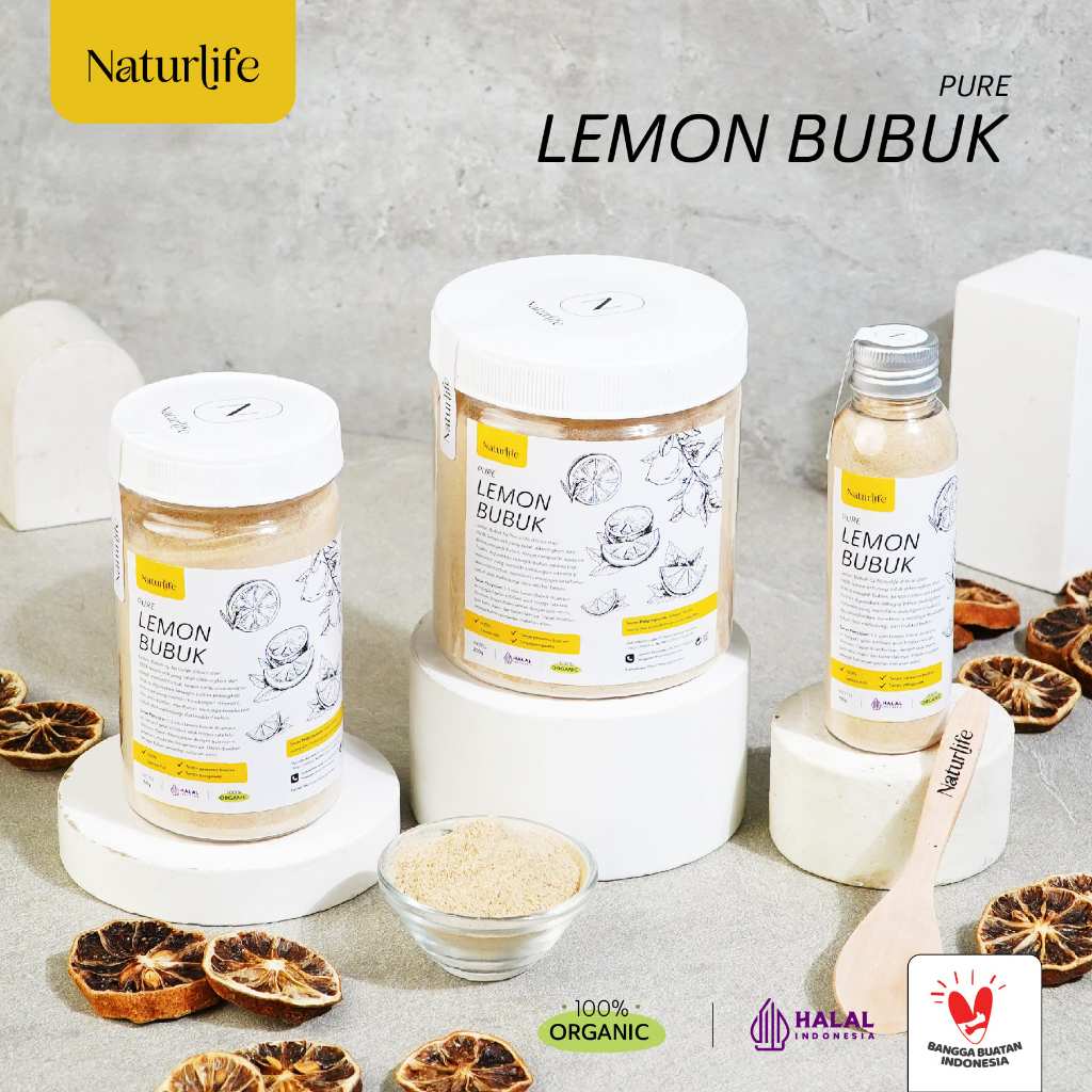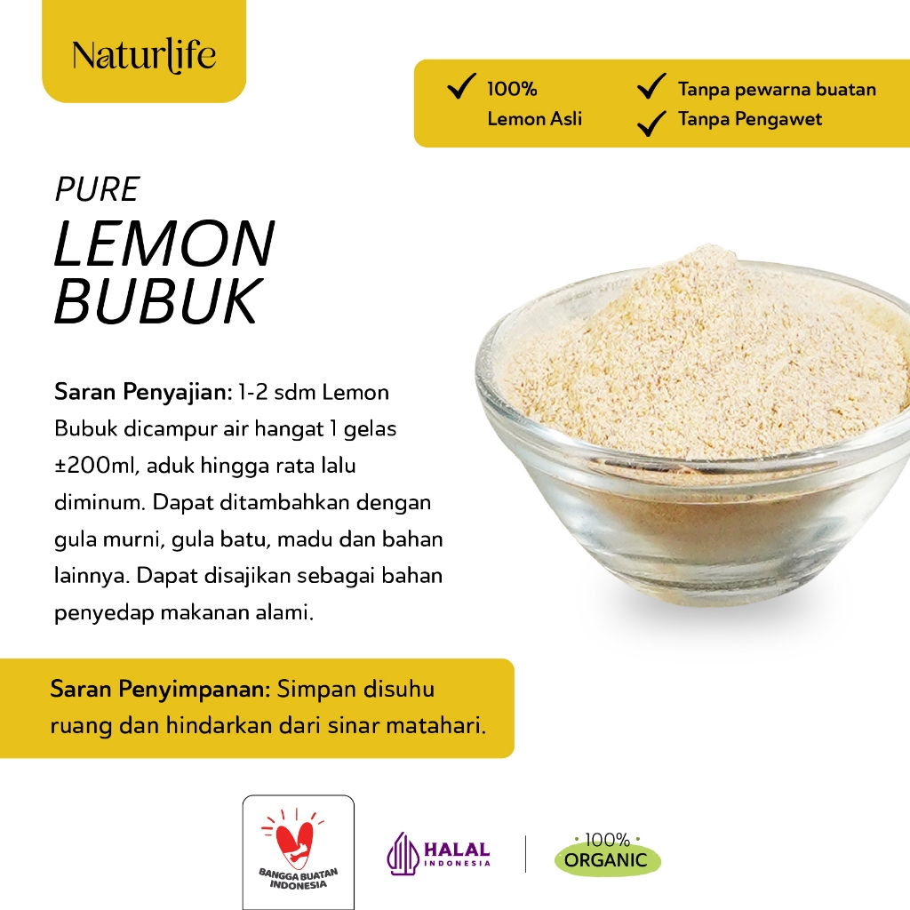 Lemon Bubuk by Naturlife dibuat dari 100% lemon asli yang telah dikeringkan dan diolah menjadi bubuk, tanpa campuran apapun. Praktis digunakan sebagai bahan pelengkap minuman yang memiliki kandungan vitamin C dan antioksidan, membantu menjaga kesehatan tubuh dan melindungi dari radikal bebas.