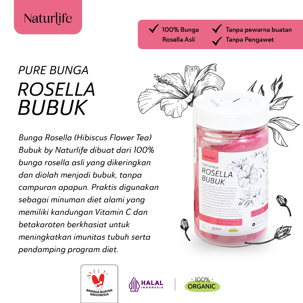 Bunga Rosella (Hibiscus Flower Tea) Bubuk by Naturlife dibuat dari 100% bunga rosella asli yang dikeringkan dan diolah menjadi bubuk, tanpa campuran apapun. Praktis digunakan sebagai minuman diet alami yang memiliki kandungan Vitamin C dan betakaroten berkhasiat untuk meningkatkan imunitas tubuh serta pendamping program diet.