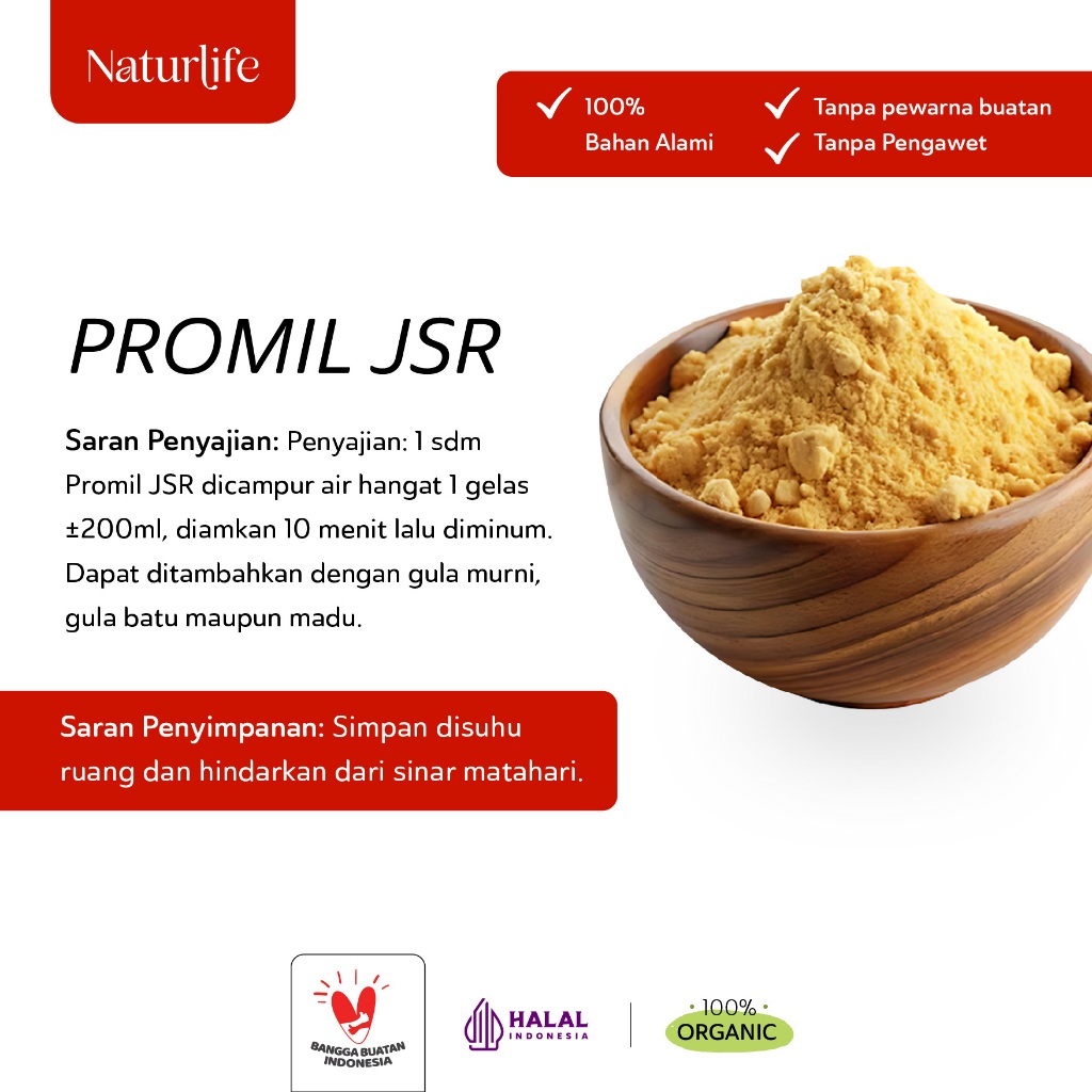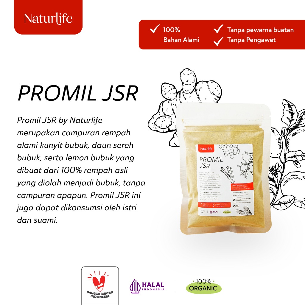 Promil JSR by Naturlife merupakan campuran rempah alami kunyit bubuk, daun sereh bubuk, serta lemon bubuk yang dibuat dari 100% rempah asli yang diolah menjadi bubuk, tanpa campuran apapun. Promil JSR ini juga dapat dikonsumsi oleh istri dan suami.