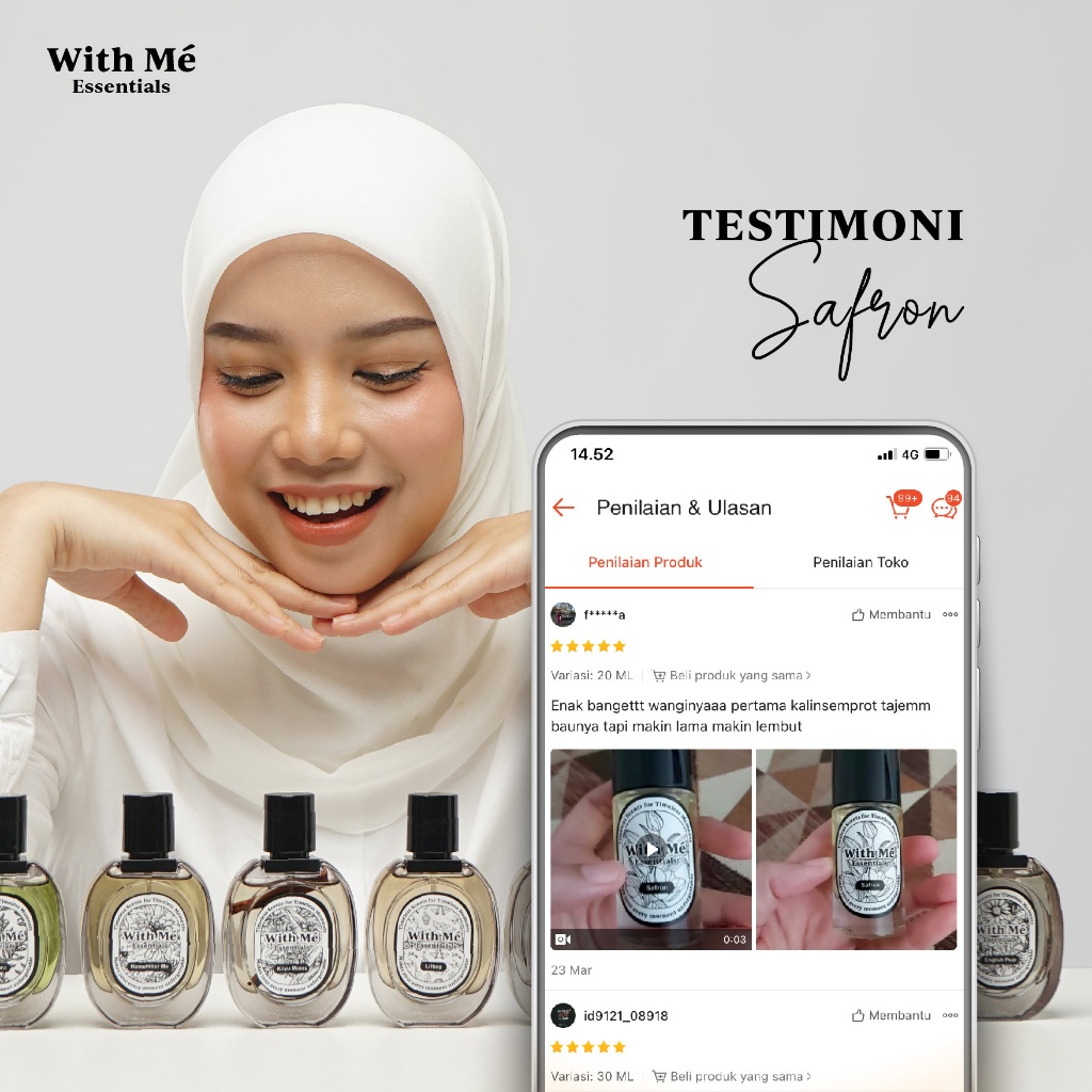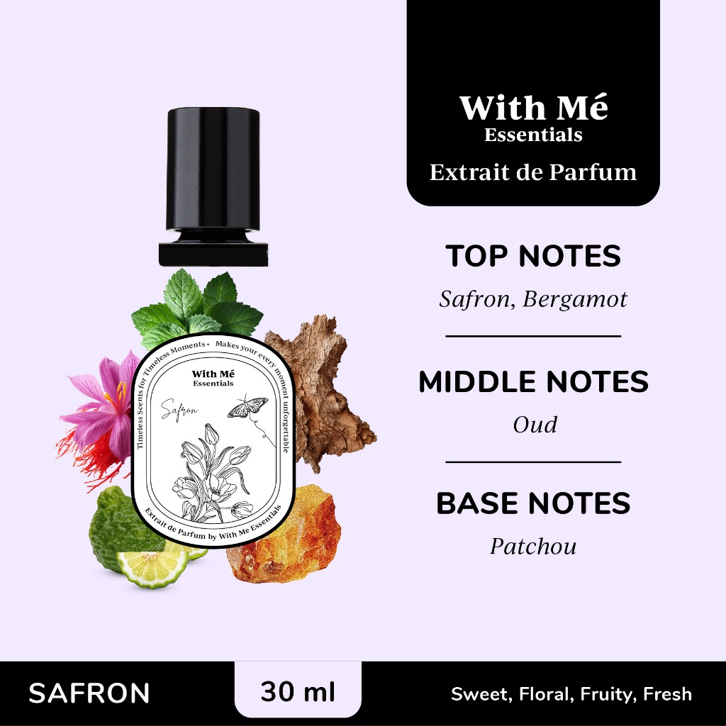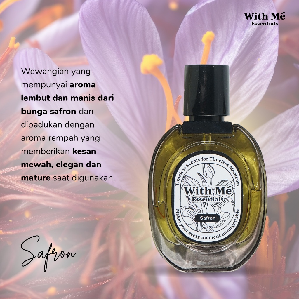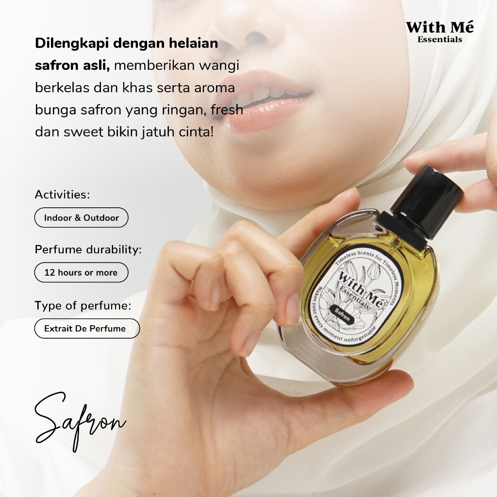 With Me Essentials - Safron adalah Extrait De Parfum / wewangian yang mempunyai aroma lembut dan manis dari bunga safron dan dipadukan dengan aroma rempah yang akan memberikan kesan mewah, elegan dan mature saat digunakan.