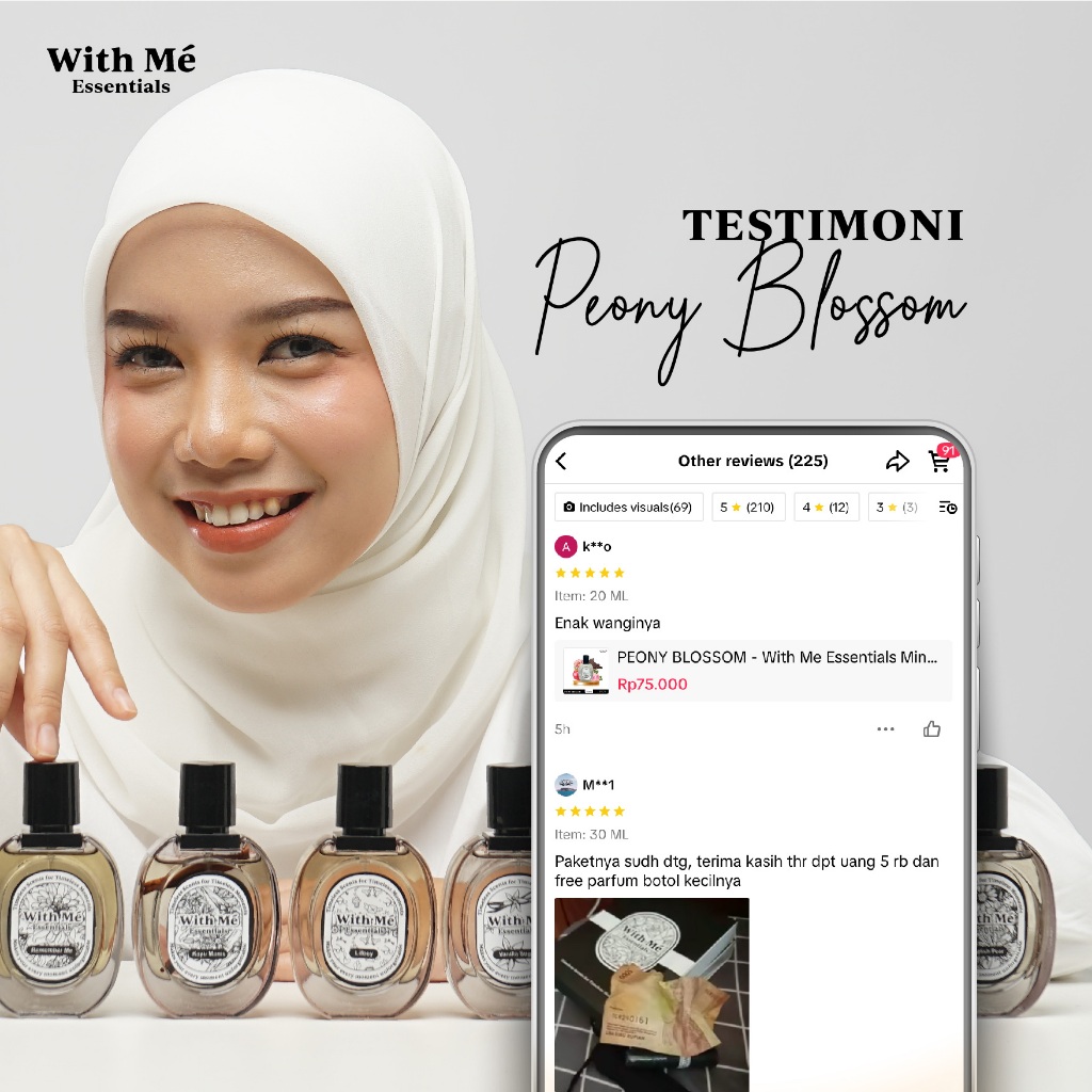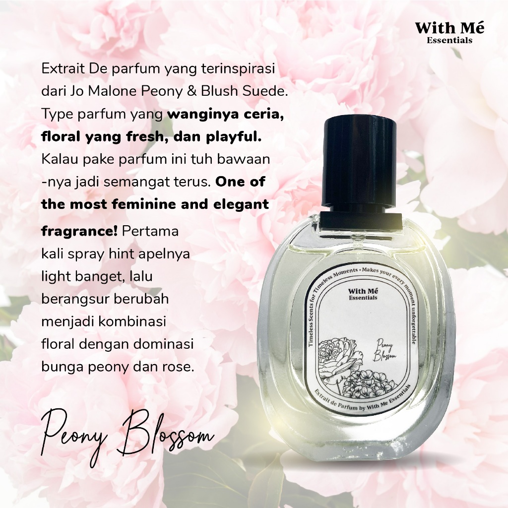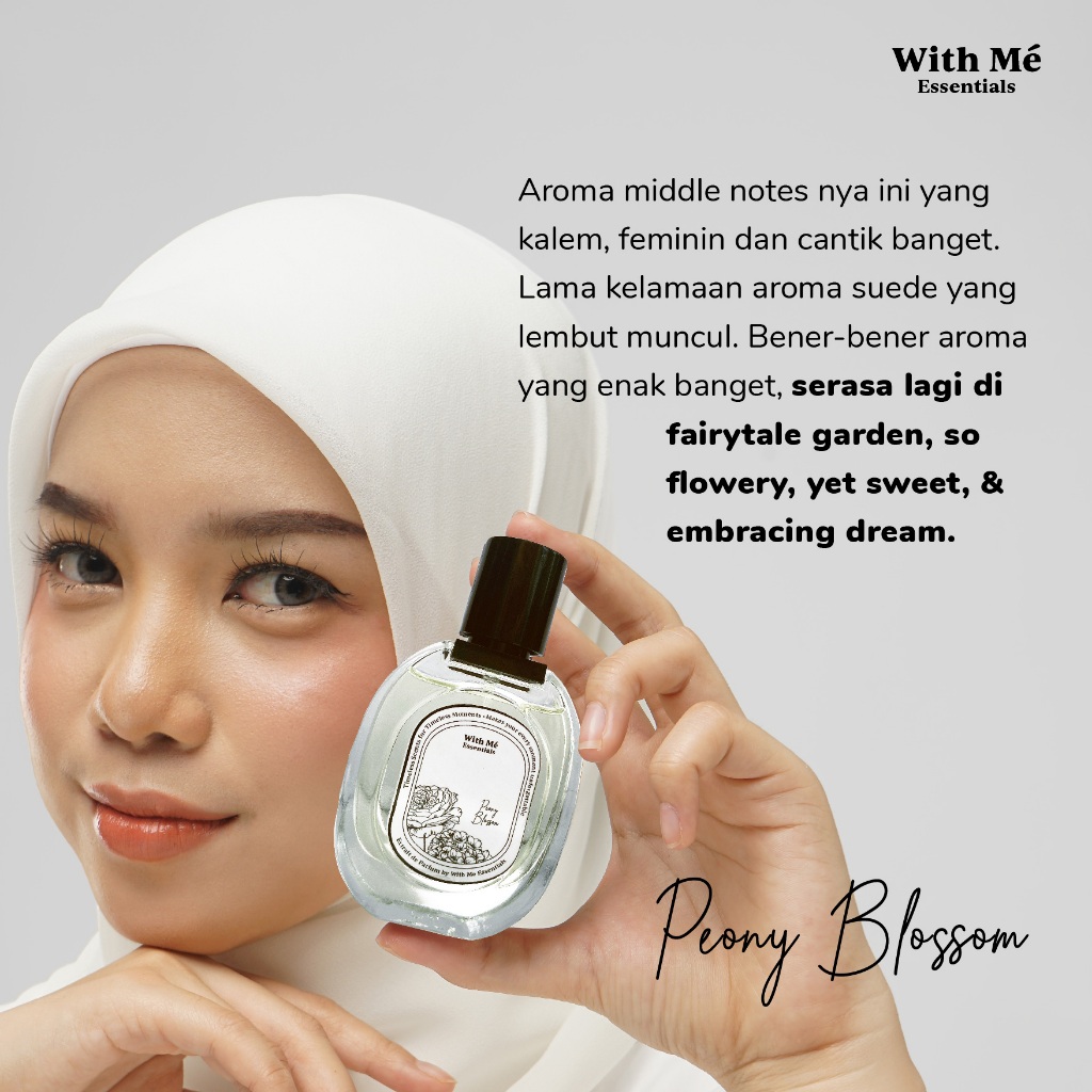 With Me Essentials - Peony Blossom Wewangian yang terinspirasi dari Jo Malone Peony & Blush Suede. Tipe parfum yang wanginya ceria, floral yang fresh, dan playful. Pertama kali spray hint apelnya light banget, lalu berangsur berubah menjadi kombinasi floral dengan dominasi bunga peony dan rose ditambah aroma suede yang lembut muncul. Serasa lagi di fairytale garden, so f lowery, yet sweet, and embracing dream!