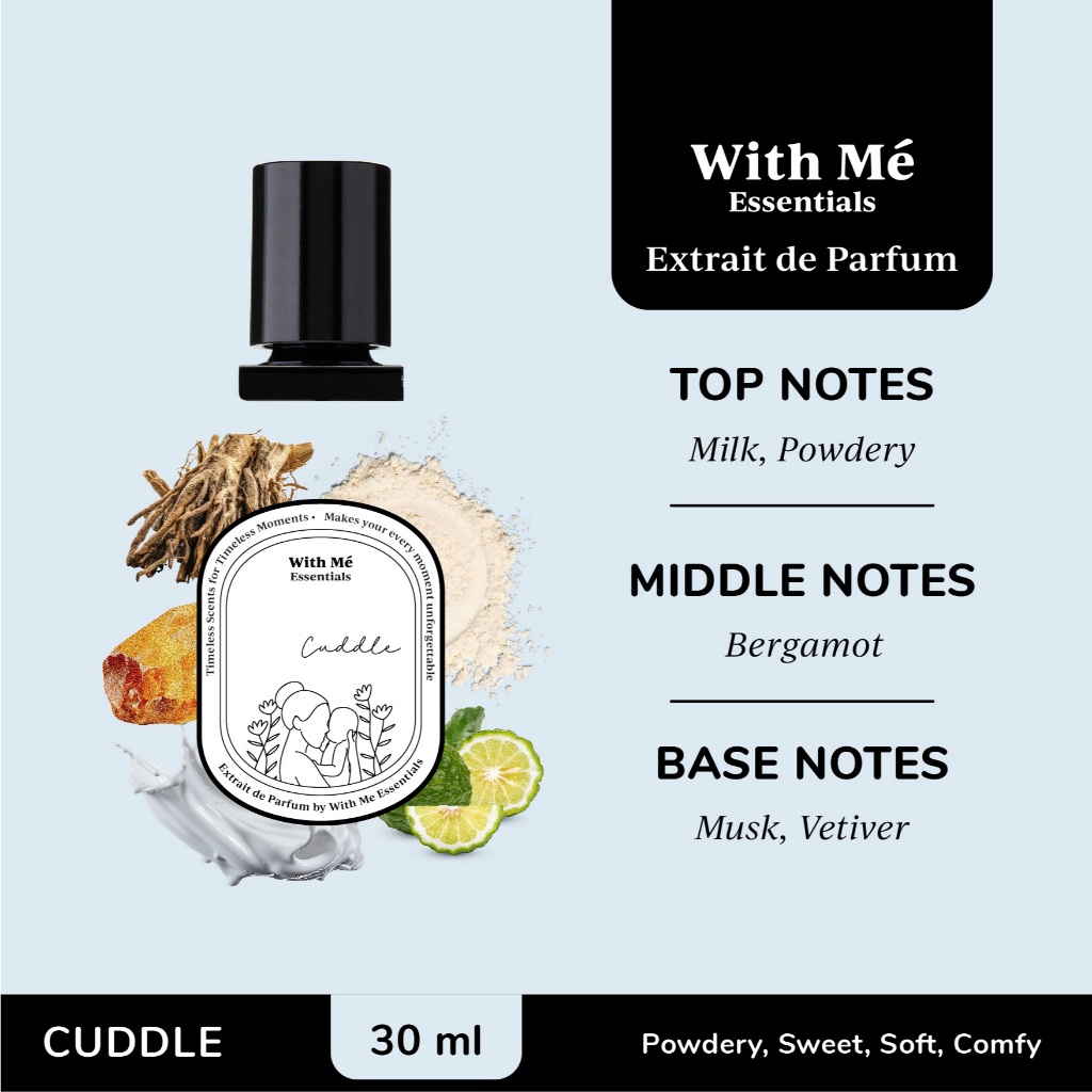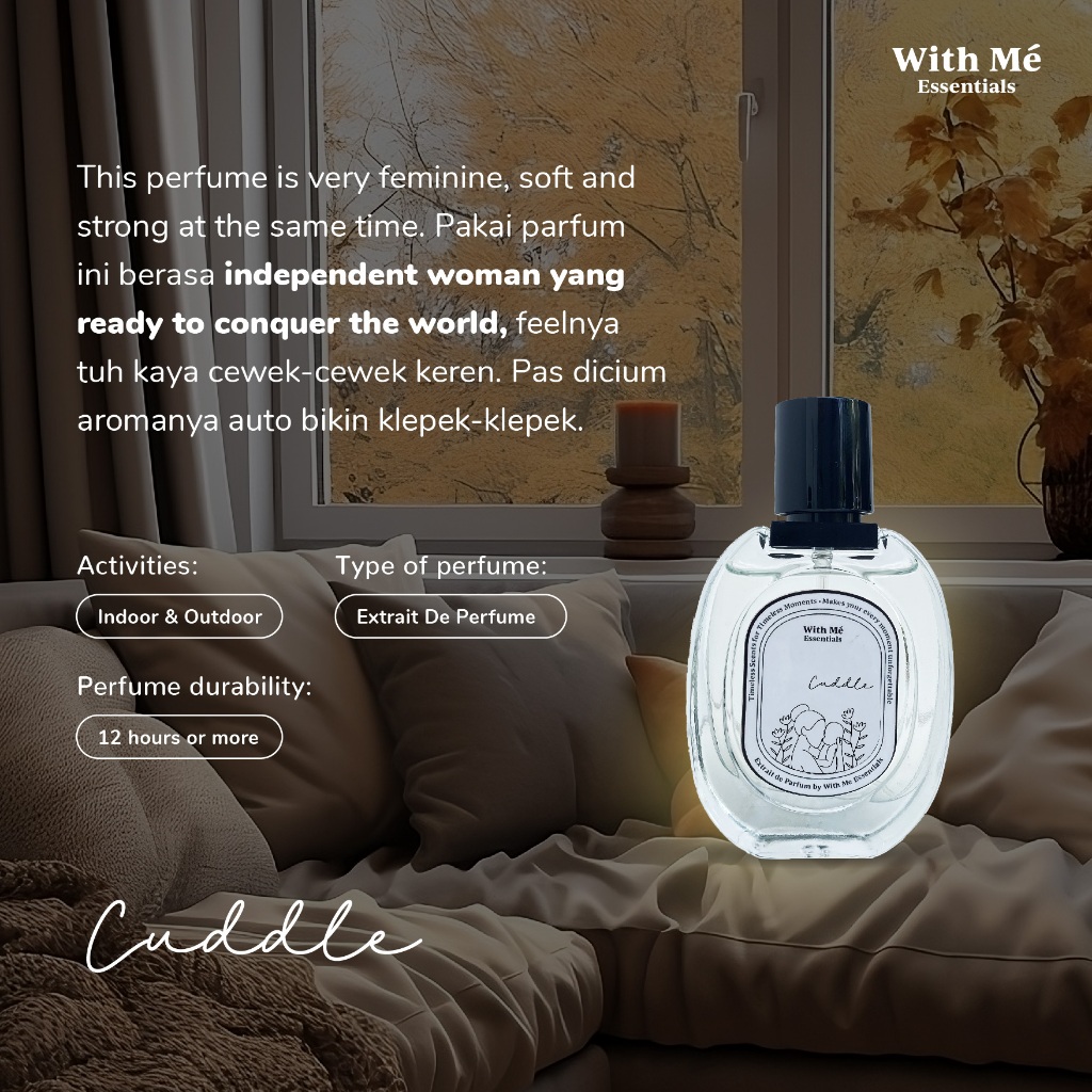 Cuddle adalah Extrait De Parfum/wewangian yang mempunyai aroma elegant and powdery. The most unique scent you’ve ever had, apalagi kalo kamu pecinta parfum aroma powdery/clean scent pasti suka sama wangi ini, this one is perfect!