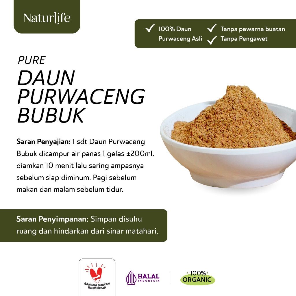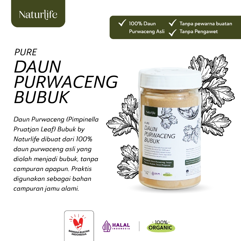 Daun Purwaceng (Pimpinella Pruatjan Leaf) Bubuk by Naturlife dibuat dari 100% daun purwaceng asli yang diolah menjadi bubuk, tanpa campuran apapun. Praktis digunakan sebagai bahan campuran jamu alami yang memiliki kandungan steroid, atsiri, furanokumarin, dan vitamin berkhasiat untuk meningkatkan vitalitas dan kesuburan pria.