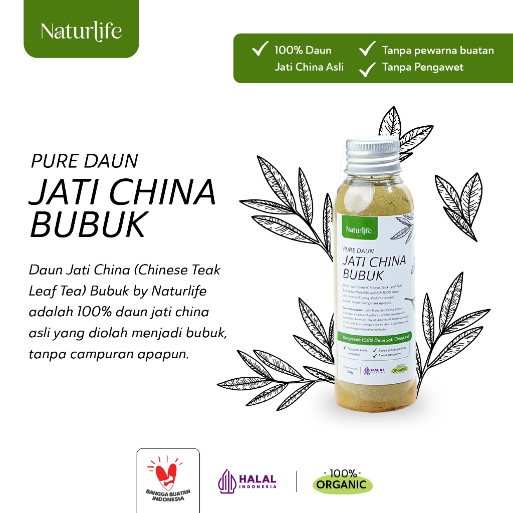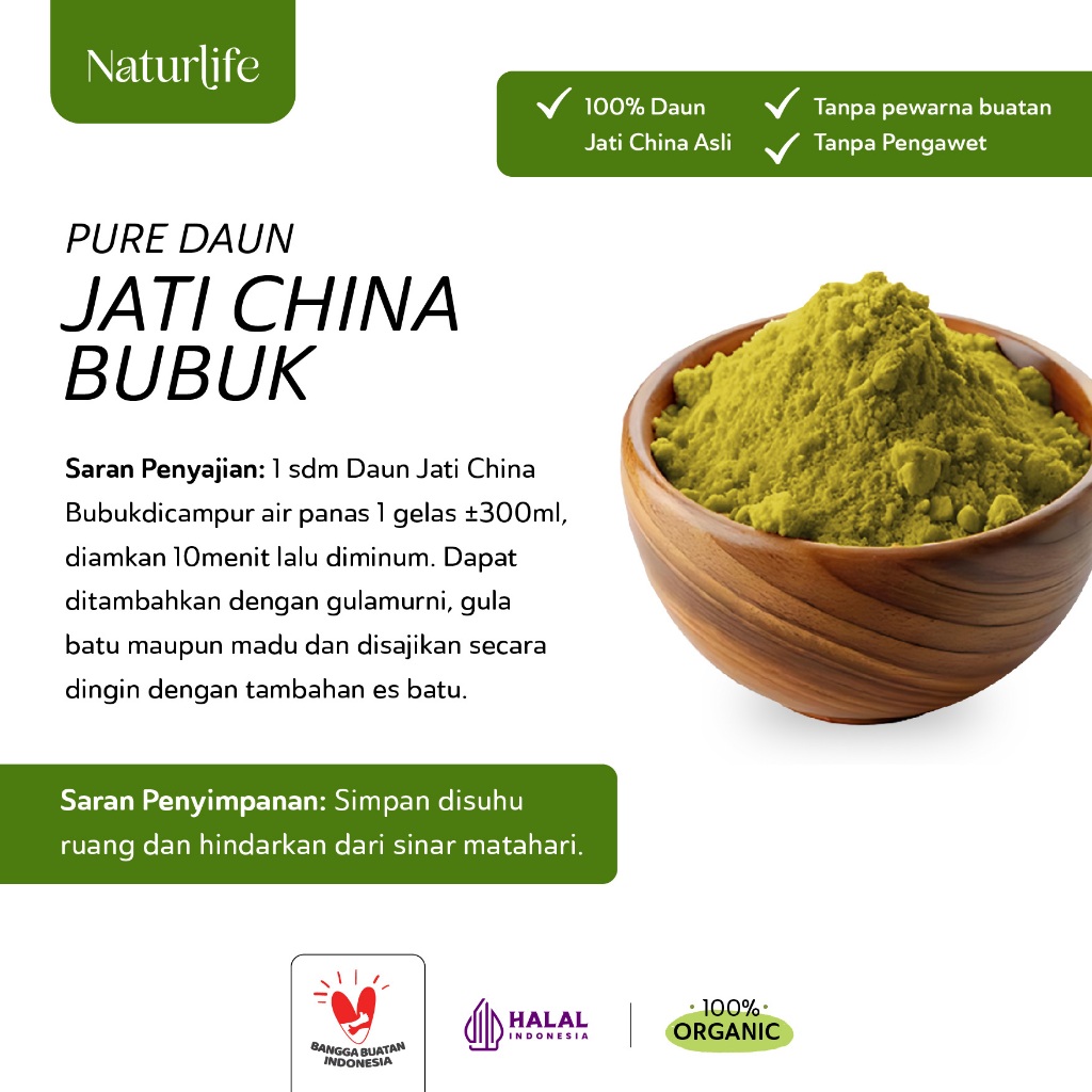 Daun Jati China (Chinese Teak Leaf Tea) Bubuk by Naturlife adalah 100% daun jati china asli yang diolah menjadi bubuk, tanpa campuran apapun. Mengandung senyawa pencahar glikosida antrakinon berkhasiat untuk melancarkan buang air besar.