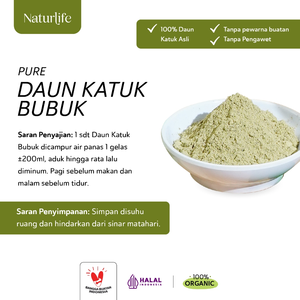 Daun Katuk (Sweet Leaf) Bubuk by Naturlife dibuat dari 100% daun katuk asli yang diolah menjadi bubuk, tanpa campuran apapun. Praktis digunakan sebagai campuran minuman herbal dan bahan penyedap makanan alami yang memiliki kandungan vitamin A, B, C, protein, kalsium, zat besi, saponin, flavonoid, tanin, dan isoflavonoid yang menyerupai estrogen.