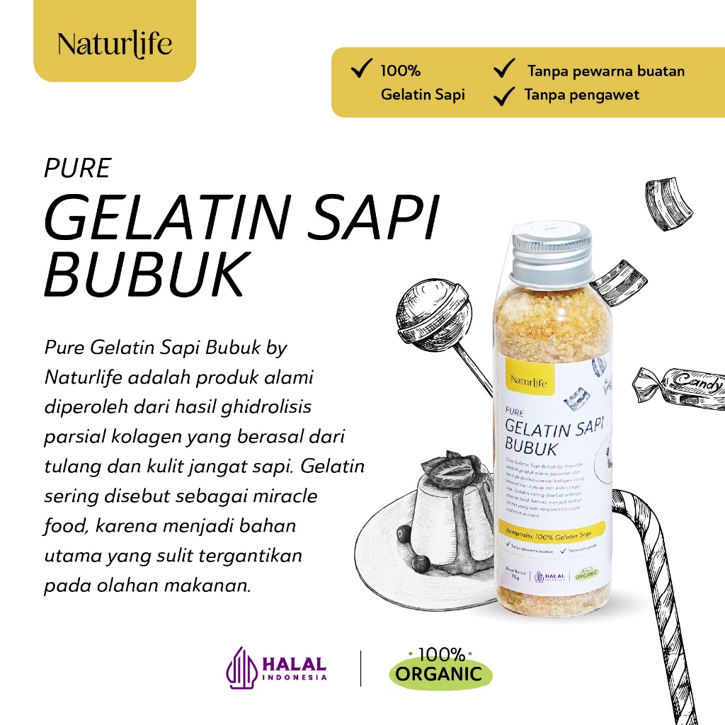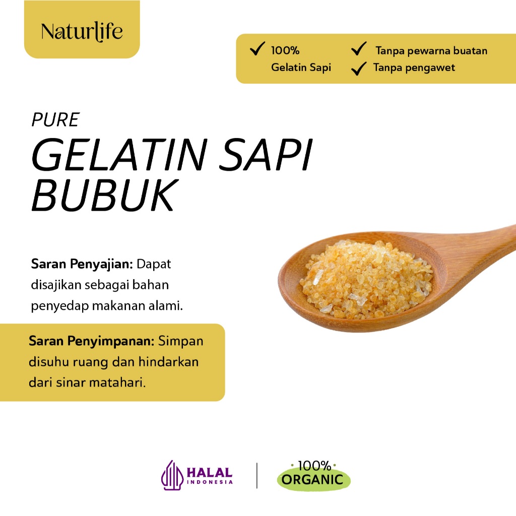 Pure Gelatin Sapi Bubuk by Naturlife adalah produk alami yang diperoleh dari hasil ghidrolisis parsial kolagen yang berasal dari tulang dan kulit jangat sapi, yang diolah tanpa mengandung zat kimia tambahan sehingga 100% aman dikonsumsi. Gelatin sering disebut sebagai miracle food, karena menjadi bahan utama yang sulit tergantikan pada olahan makanan.