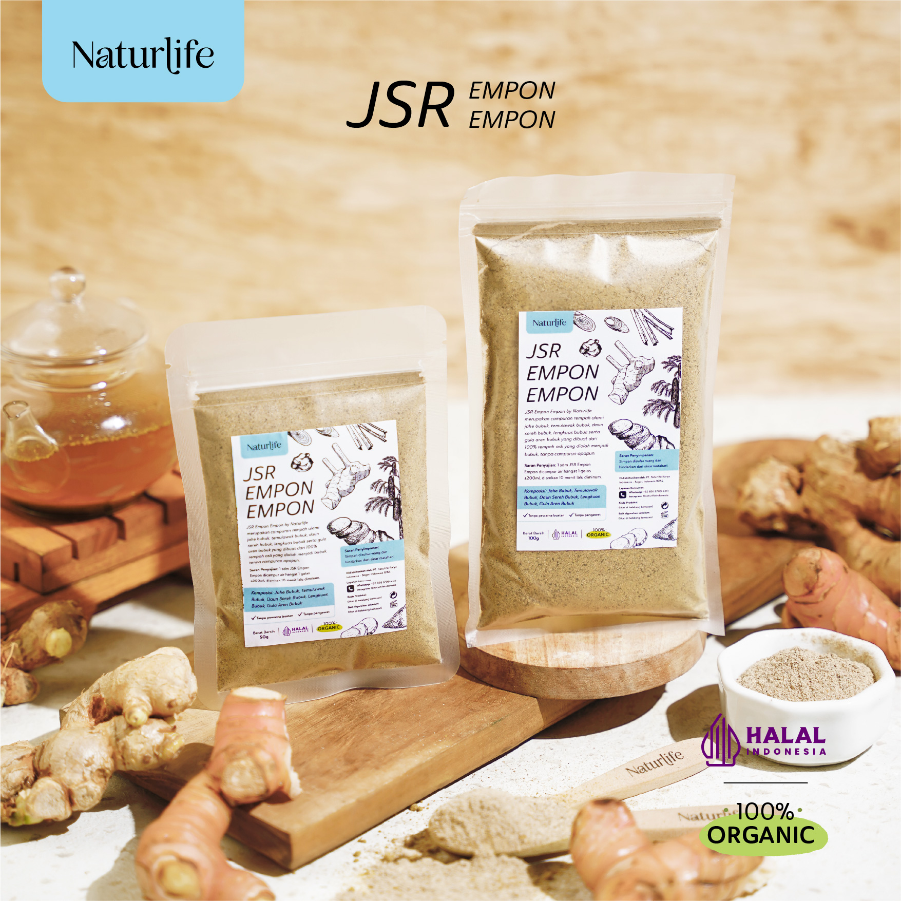 JSR Empon Empon by Naturlife merupakan campuran rempah alami jahe bubuk, temulawak bubuk, daun sereh bubuk, lengkuas bubuk serta gula aren bubuk yang dibuat dari 100% rempah asli yang diolah menjadi bubuk, tanpa campuran apapun.