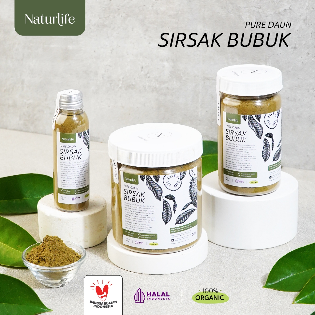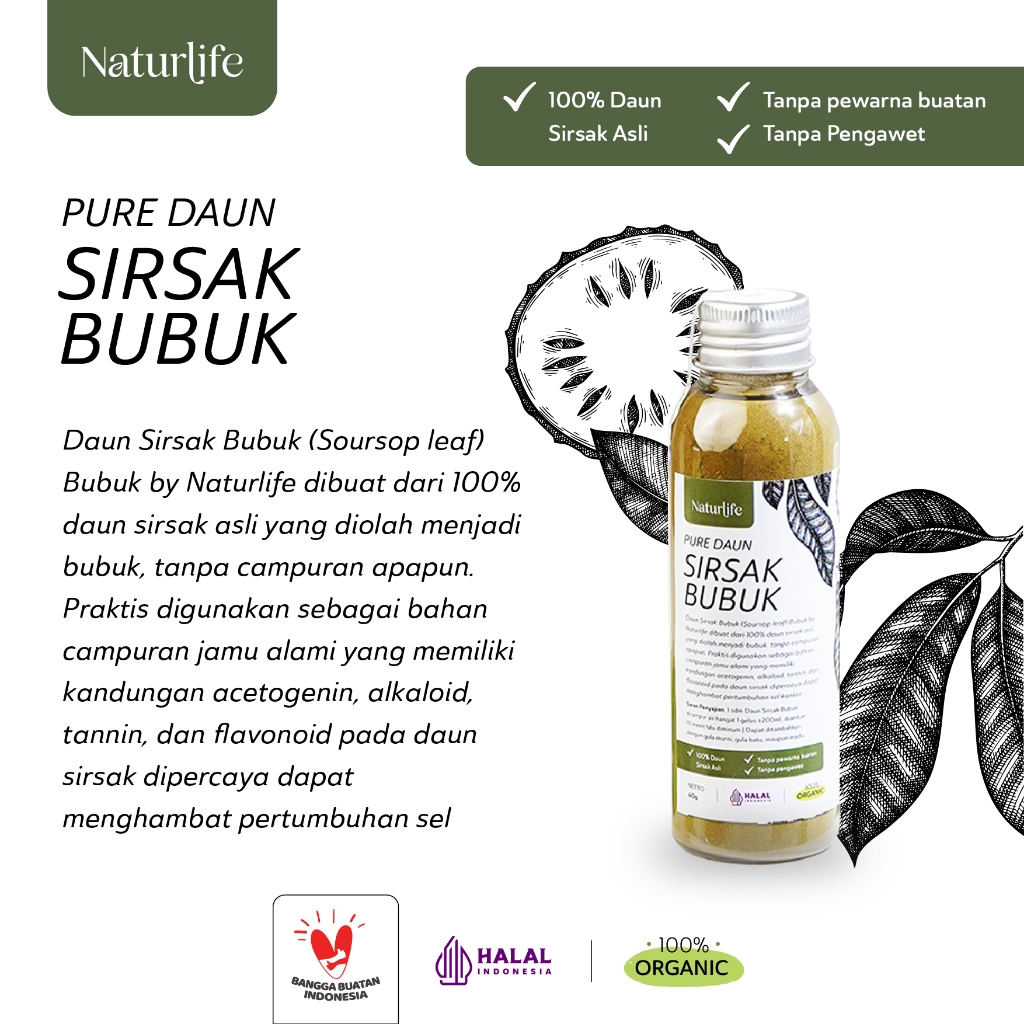 Daun Sirsak Bubuk (Soursop leaf) Bubuk by Naturlife dibuat dari 100% daun sirsak asli yang diolah menjadi bubuk, tanpa campuran apapun. Praktis digunakan sebagai bahan campuran jamu alami yang memiliki kandungan acetogenin, alkaloid, tannin, dan flavonoid pada daun sirsak dipercaya dapat menghambat pertumbuhan sel kanker.