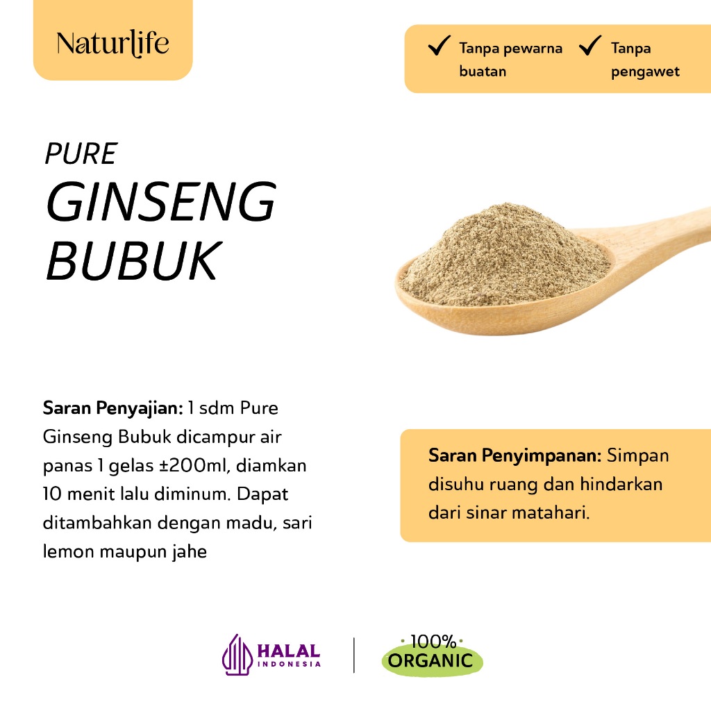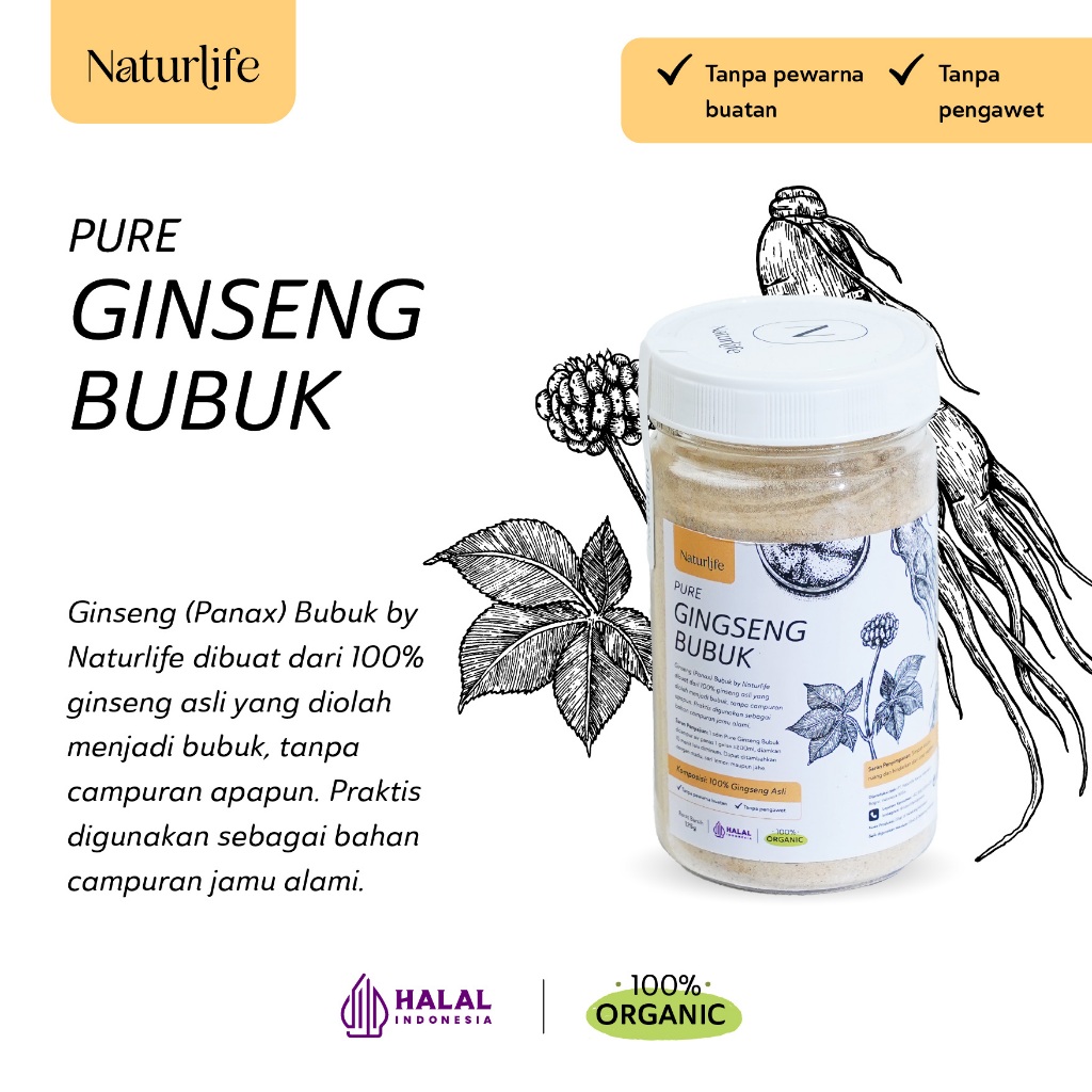 Ginseng (Panax) Bubuk by Naturlife dibuat dari 100% ginseng asli yang diolah menjadi bubuk, tanpa campuran apapun. Praktis digunakan sebagai bahan campuran jamu alami yang memiliki zat aktif ginsenoside berkhasiat untuk meningkatkan kinerja fisik dan mental, menambah ketahanan terhadap stres, penyakit, dan menccgah kelelahan. Ginseng banyak dikonsumsi oleh olahragawan untuk meningkatkan kinerja fisik.