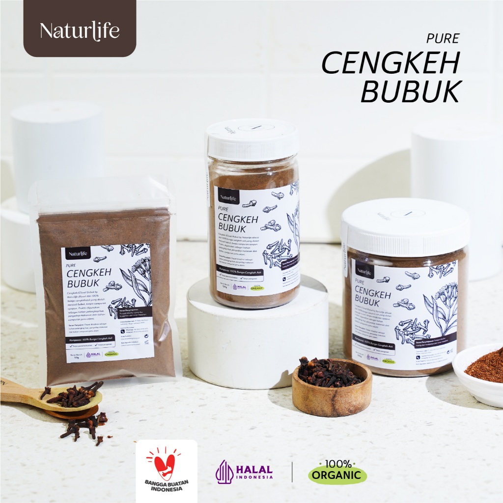 Cengkeh (Clove) Bubuk by Naturlife dibuat dari 100% bunga cengkeh asli yang diolah menjadi bubuk, tanpa campuran apapun. Praktis digunakan sebagai penyedap makanan dan bahan campuran jamu alami yang memiliki kandungan eugenol, saponin, tannin, dan flavonoid berkhasiat sebagai obat rematik, asam urat tinggi, batuk, masuk angin, gangguan lambung, nyeri dada dan perut serta sakit gigi.