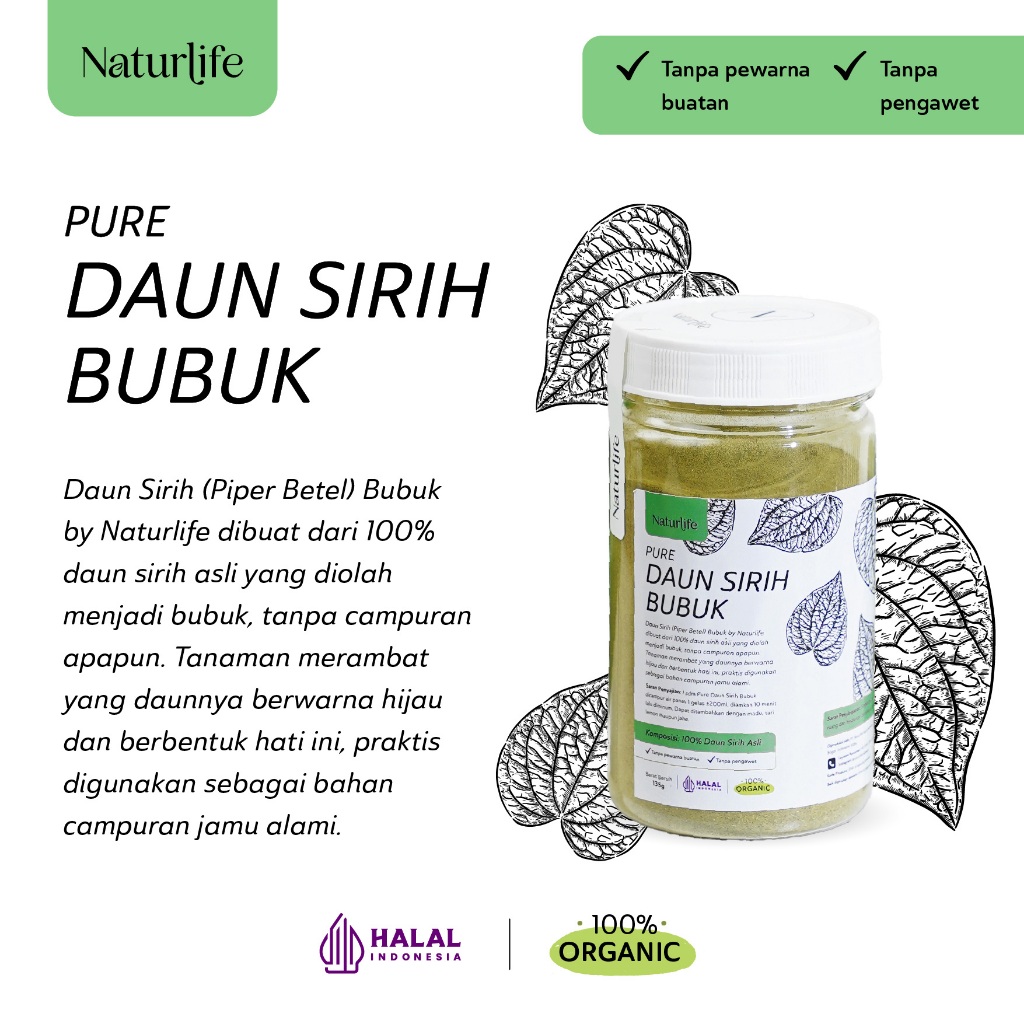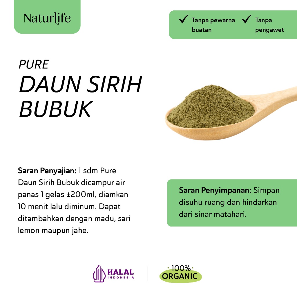 Daun Sirih (Piper Betel) Bubuk by Naturlife dibuat dari 100% daun sirih asli yang diolah menjadi bubuk, tanpa campuran apapun. Tanaman merambat yang daunnya berwarna hijau dan berbentuk hati ini, praktis digunakan sebagai bahan campuran jamu alami yang mengandung zat antiseptik. Daun sirih sebagai obat tradisional berkhasiat untuk kesehatan.